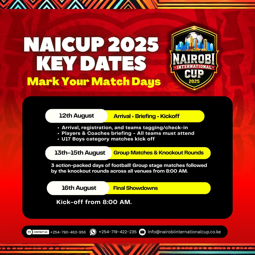 Get ready for the biggest youth football showdown — the Nairobi International Cup 2025 (NAICUP 2025)! This highly anticipated tournament brings together young talent, passionate teams, and action-packed matches that showcase the future of football.